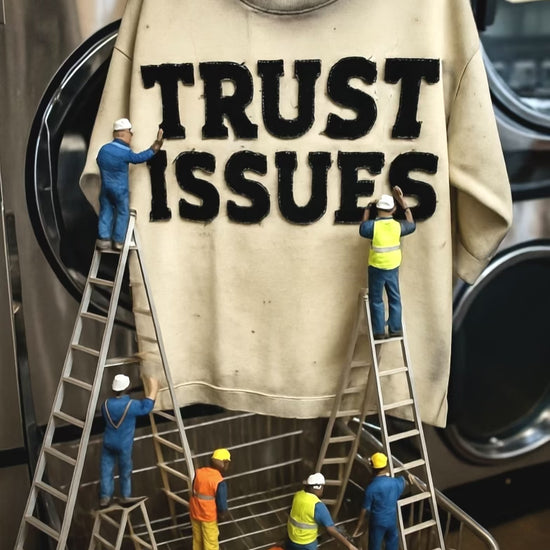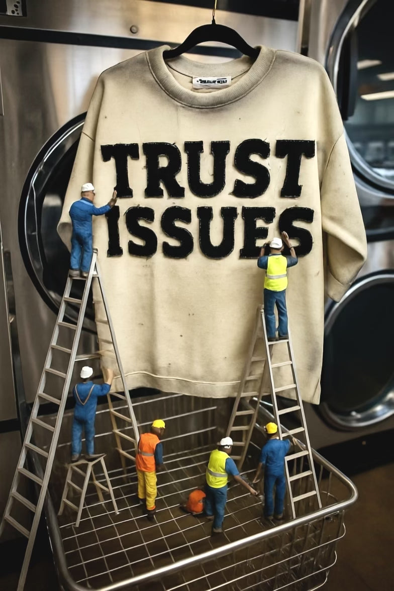 FABRICATED LOVE CREAM & BLACK “TRUST ISSUES” DROP SHOULD RHINESTONE TEE.