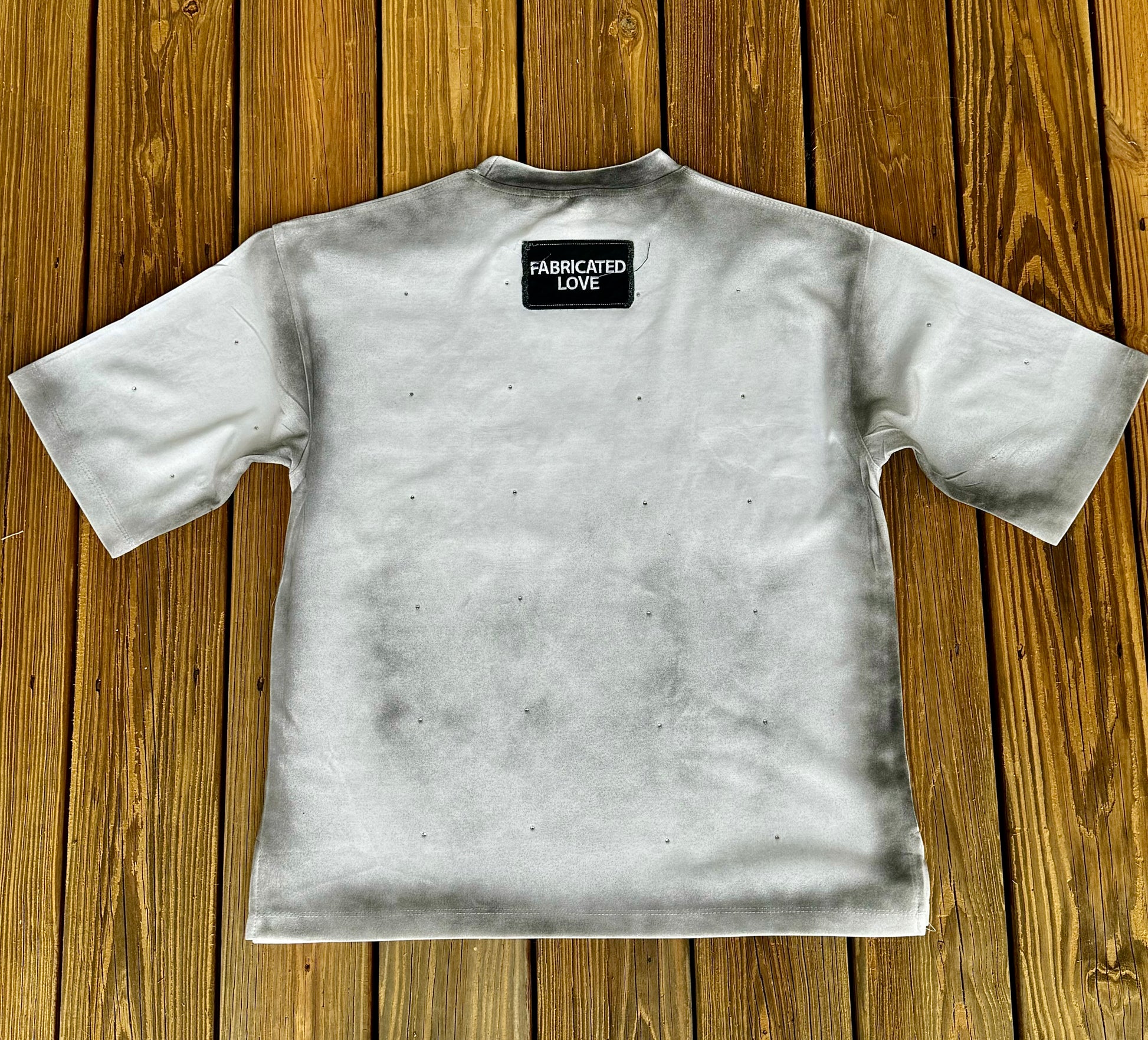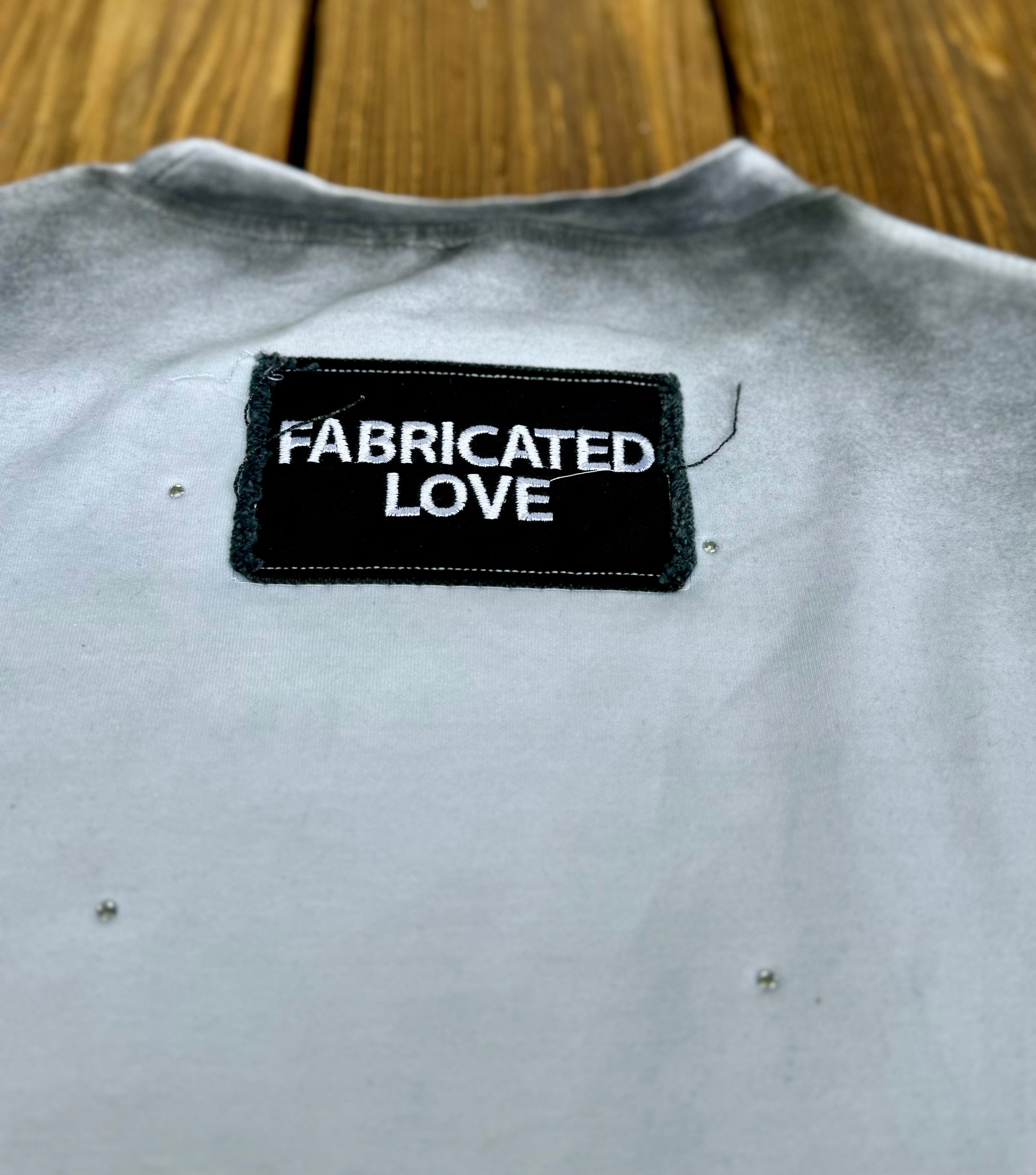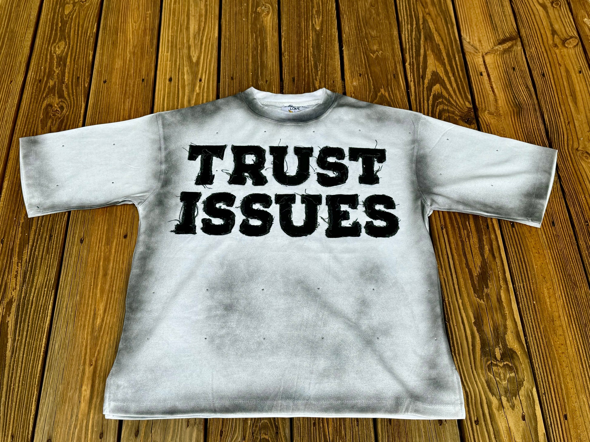 FABRICATED LOVE WHITE & BLACK “TRUST ISSUES” DROP SHOULD RHINESTONE TEE.