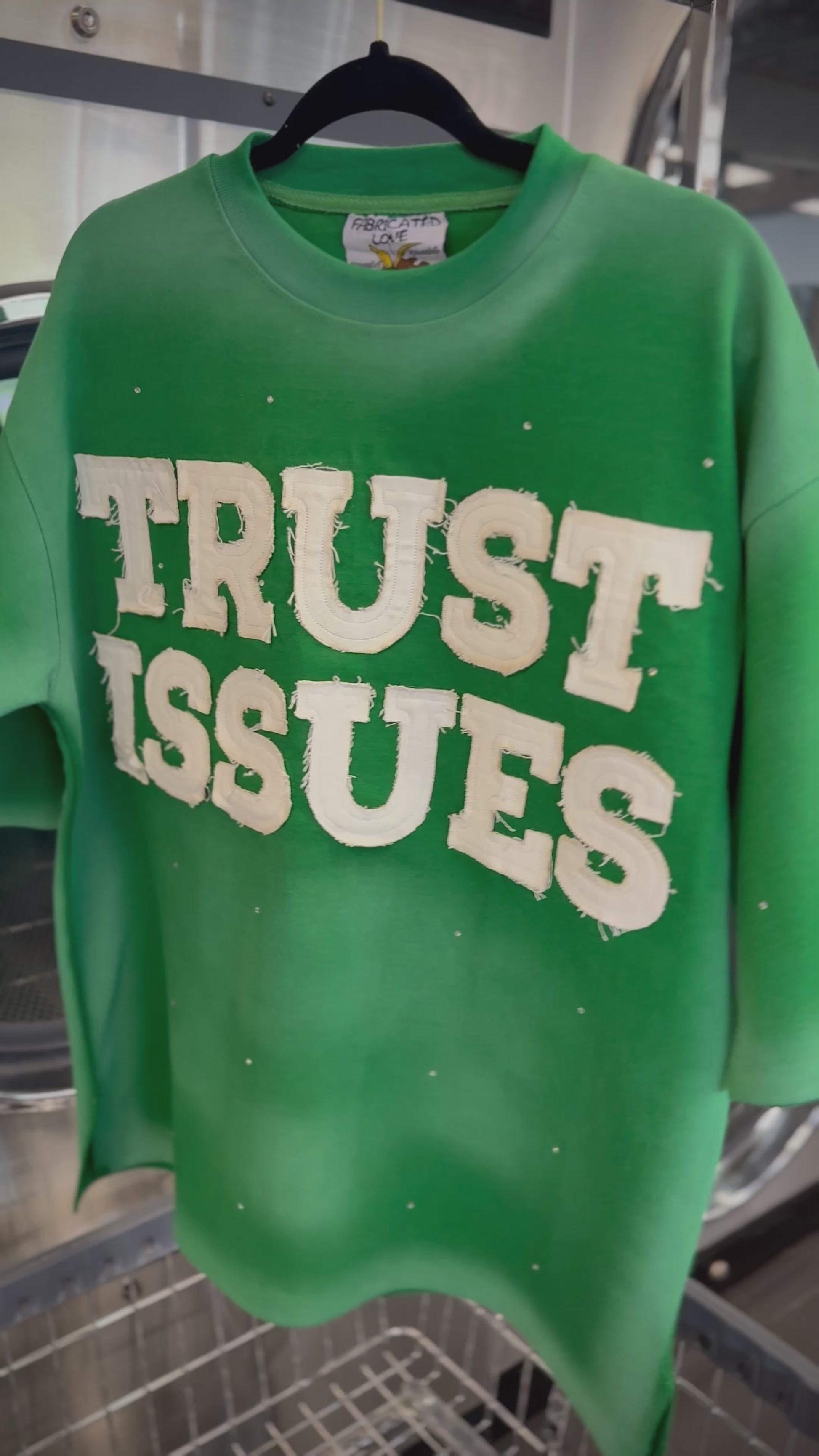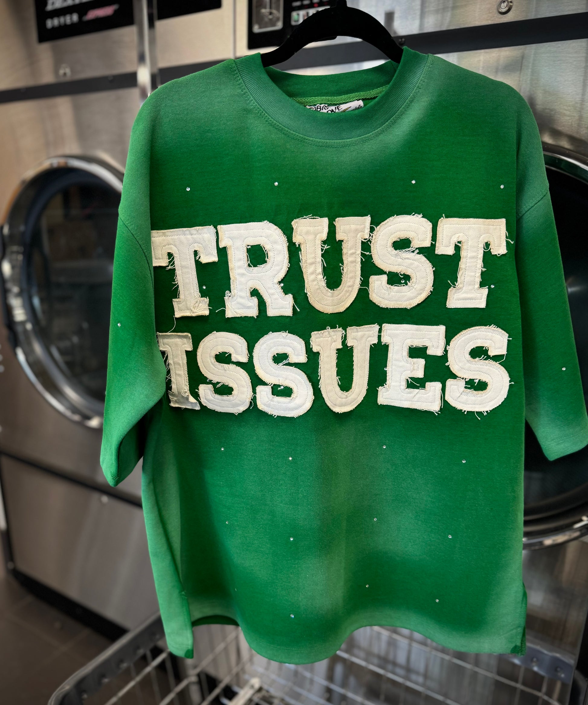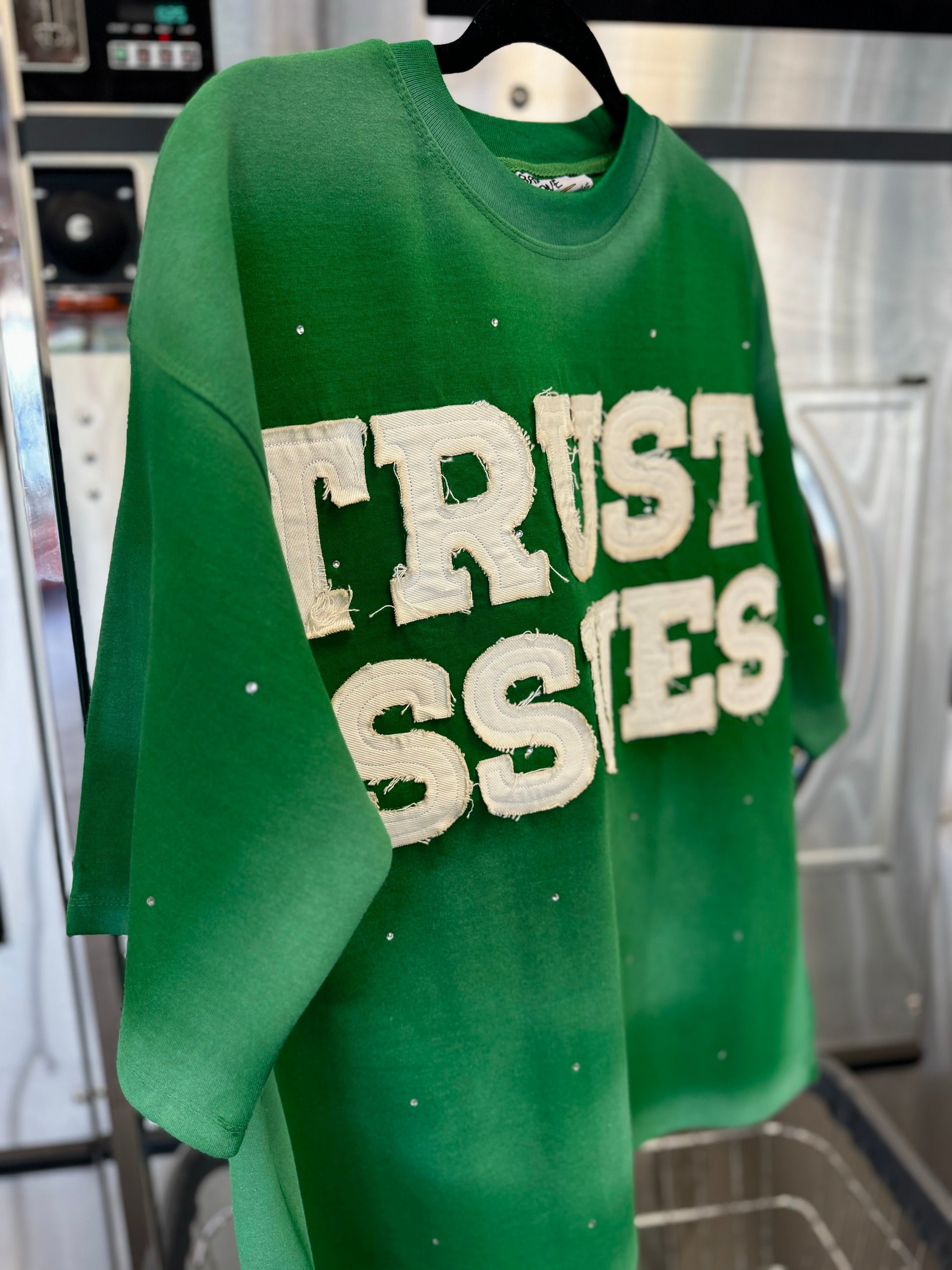 FABRICATED LOVE GREEN & WHITE “TRUST ISSUES” DROP SHOULD RHINESTONE TEE.